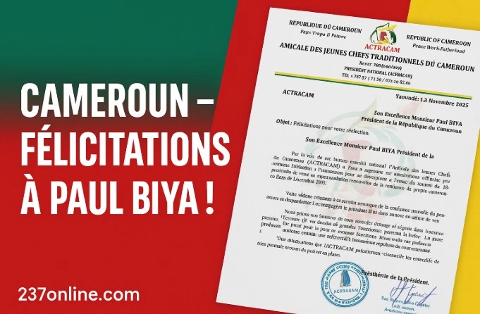 La nouvelle fait écho dans tout le pays. L’Amicale des Jeunes Chefs Traditionnels du Cameroun (ACTRACAM) a adressé ce 3 novembre 2025 une lettre officielle de félicitations au président Paul Biya, récemment réélu à la tête de l’État. Dans le document signé par Sa Majesté Ngaye Jean Michel, l’amicale salue une victoire « éclatante » et appelle à « un septennat riche en réalisations ». Entre tradition, loyauté et symbolique nationale, ce message témoigne d’un soutien ancré dans la chefferie jeune. Mais derrière ces félicitations, quelles attentes réelles portent ces gardiens de la culture ?