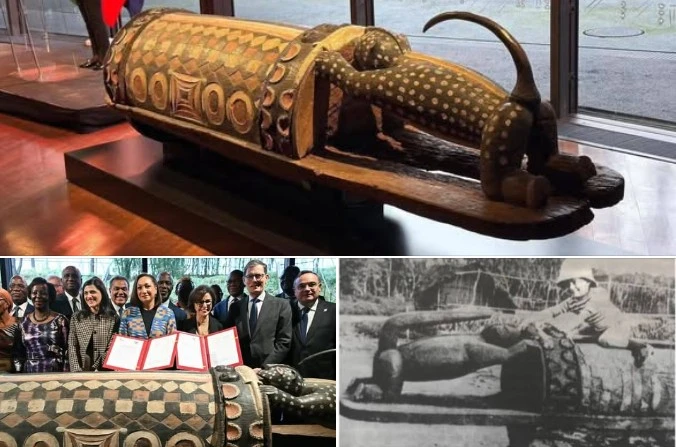Le tambour Djidji Ayôkwé, long de 3 mètres et pesant 430 kg, occupait une place centrale dans la culture du peuple Ébrié. Utilisé pour transmettre des messages et accompagner des rituels sacrés, il représentait bien plus qu’un objet : c’était un instrument d’identité et de souveraineté. Pourtant, en 1916, les autorités coloniales françaises l’ont saisi avant de l’envoyer en France en 1929, où il a été conservé pendant près d’un siècle.