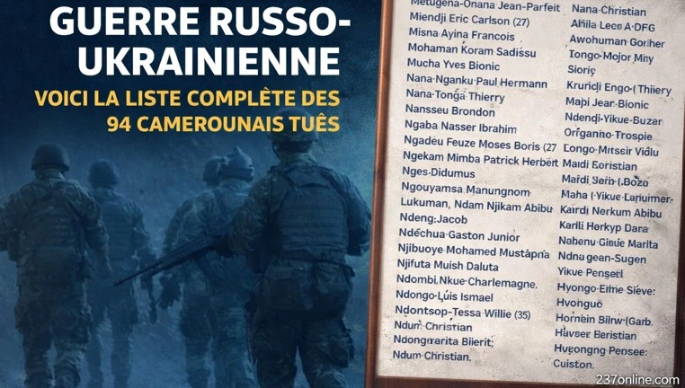 Selon les données publiées par l’association pro-ukrainienne INPACT, au moins 335 Camerounais ont été recrutés dans la guerre russo-ukrainienne, et plusieurs dizaines ont déjà été confirmés morts. Parmi les Camerounais identifiés figurent notamment Metugena-Onana Jean-Parfait, Miendji Eric Carlson, Misna Ayina Francois, Mohaman Koram Sadissu, Mucha Yves Bionic, Nana Nganku Paul Hermann, Nana Tonga Thierry, Nansseu Brondon, Ngaba Nasser Ibrahim, Ngadeu Feuze Moses Boris (27 ans), Ngekam Mimba Patrick Herbert, Nges Didumus, Ngouyamsa Manungnom Lukuman, Ndam Njikam Abibu, Ndeng Jacob, Ndechua Gaston Junior, Njibuoye Mohamed Mustapha, Njifuta Muish Daluta, Ndombi Nkue Charlemagne, Ndongo Luis Ismael, Ndontsop-Tessa Willie (35 ans), et Ndum Christian.